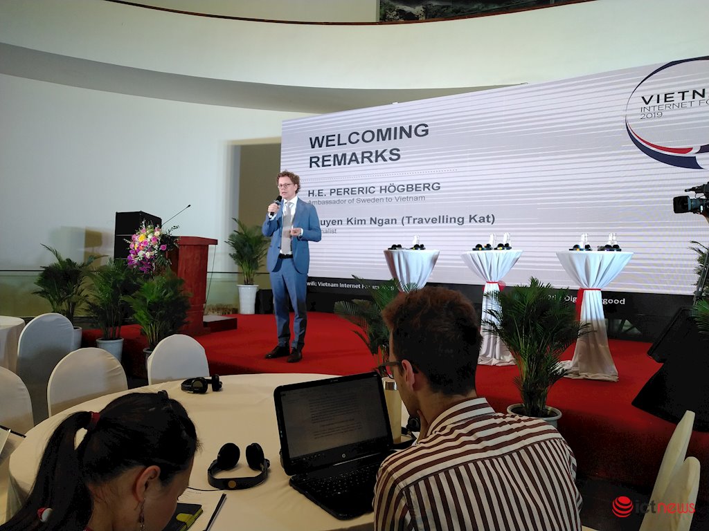 Ông Pereric Hogberg - Đại sứ Thụy Điển tại Việt Nam phát biểu khai mạc phiên thảo luận chuyên đề "Chính phủ số cho những điều tốt đẹp" tại VIF19. |