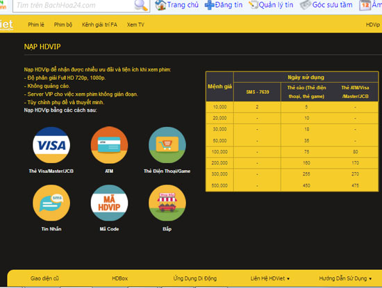 Trang movies.hdviet.com cho phép người dùng nạp tài khoản HDVIP bằng nhiều hình thức như: tin nhắn, thẻ cào di động, thẻ game, nạp bằng tài khoản ngân hàng qua hệ thống Smartlink, thẻ VISA. Và đặc biệt trang movies.hdviet.com còn tự phát hành mã thẻ HDVIP và đặt ra một đơn vị tiền ảo là Bắp để bán cho người xem. Phí mà người xem phải trả dao động từ 1.000 - 2.000 đồng/ngày.