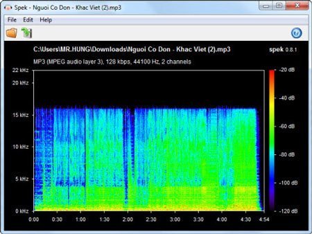 Sau đó, chúng tôi tiến hành kiểm tra phổ tẩn số của file âm thanh, cách thường được những người chơi âm thanh high-end sử dụng để rà soát những file nhạc chất lượng cao "hàng giả", thông qua phần mềm Spek.