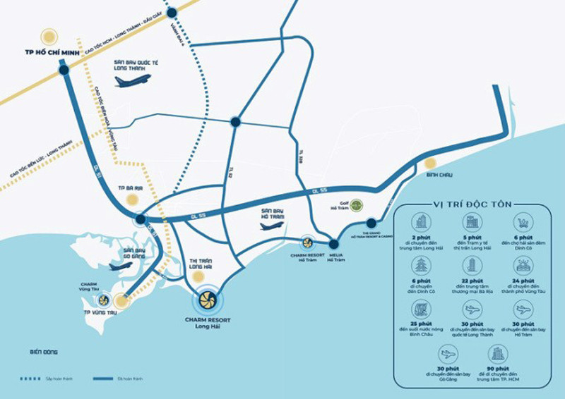 Không chỉ sở hữu lợi thế vàng trên cung đường resort tỷ đô, từ biệt thự Charm Resort Long Hải, du khách còn di chuyển dễ dàng tới sân bay quốc tế Long Thành chỉ trong 1 tiếng, tới trung tâm kinh tế TP.HCM trong chưa đầy 2 tiếng di chuyển. Như vậy, không chỉ đón trọn dòng khách thượng lưu của khu vực phía Nam và du khách quốc tế, biệt thự nghỉ dưỡng 5 sao còn là điểm đến tăng giá bứt phá trong tương lai khi Long Hải trở thành đô thị du lịch giai đoạn 2025-2030.