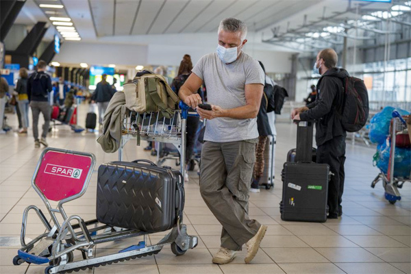Hành khách xếp hàng tại sân bay ở Johannesburg, Nam Phi để về Pháp. Ảnh: AP