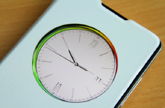 Bao da được khoét vòng tròn ở mặt trước thể hiện đồng hồ khi đóng lại với những vòng tròn màu sắc rực rỡ.