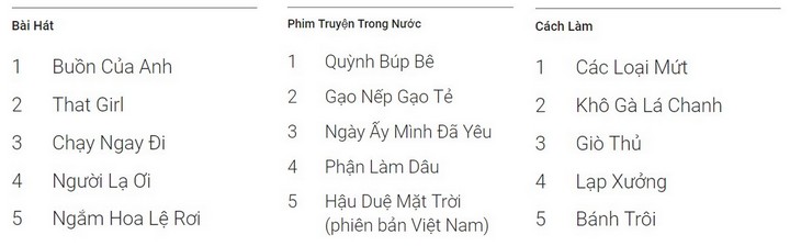 Bạn đọc quan tâm có thể theo dõi danh sách nội dung tìm kiếm thịnh hành nhất tại Việt Nam trong năm 2018 tại đây và trên thế giới tại đây.