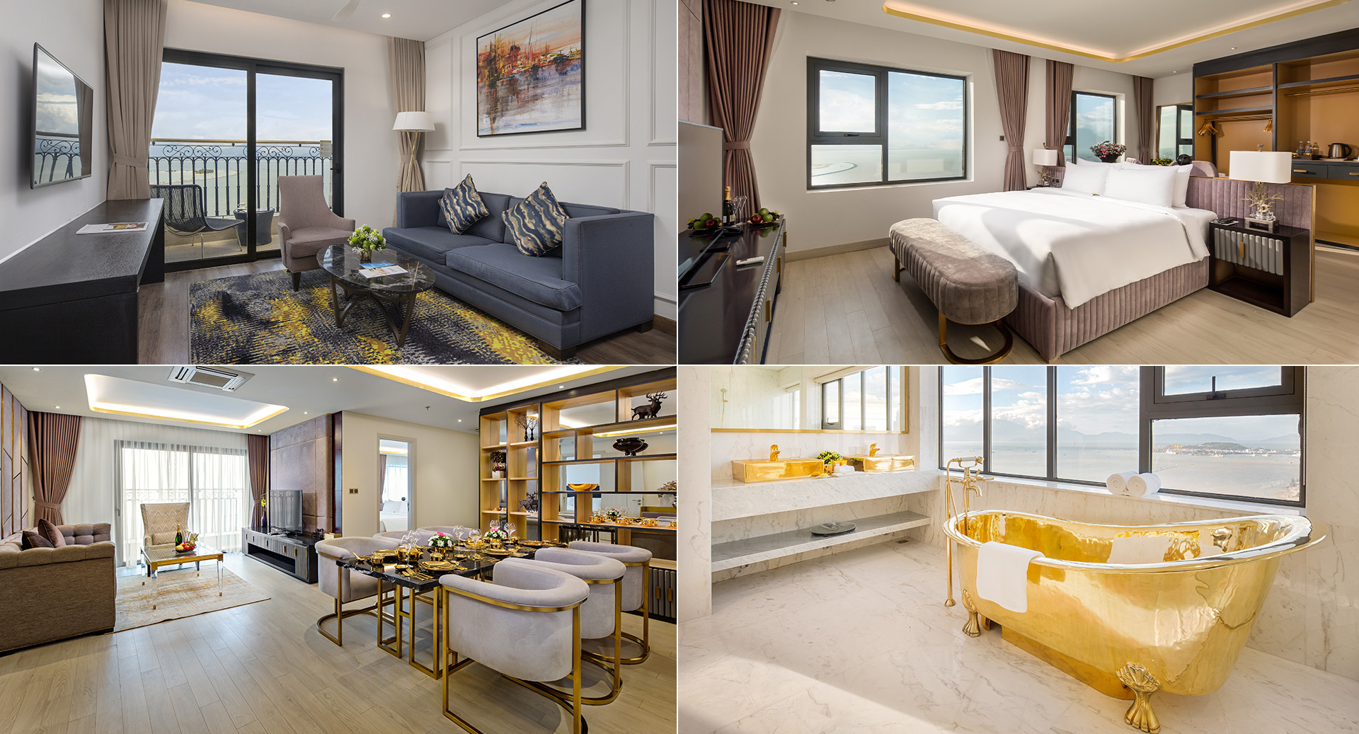 Nội thất phòng mang phong cách hiện đại, tinh giản, kết hợp cùng những chi tiết dát vàng tinh tế trong khu vực phòng tắm - một điểm nhấn vừa đủ để tạo cảm giác khác biệt mà không làm mất đi sự ấm cúng cần thiết cho trải nghiệm lưu trú dài ngày. Đối với nhóm gia đình hoặc khách lưu trú theo nhóm, các hạng suite góc với không gian sinh hoạt chung rộng rãi là lựa chọn phù hợp, đáp ứng nhu cầu riêng tư lẫn kết nối.