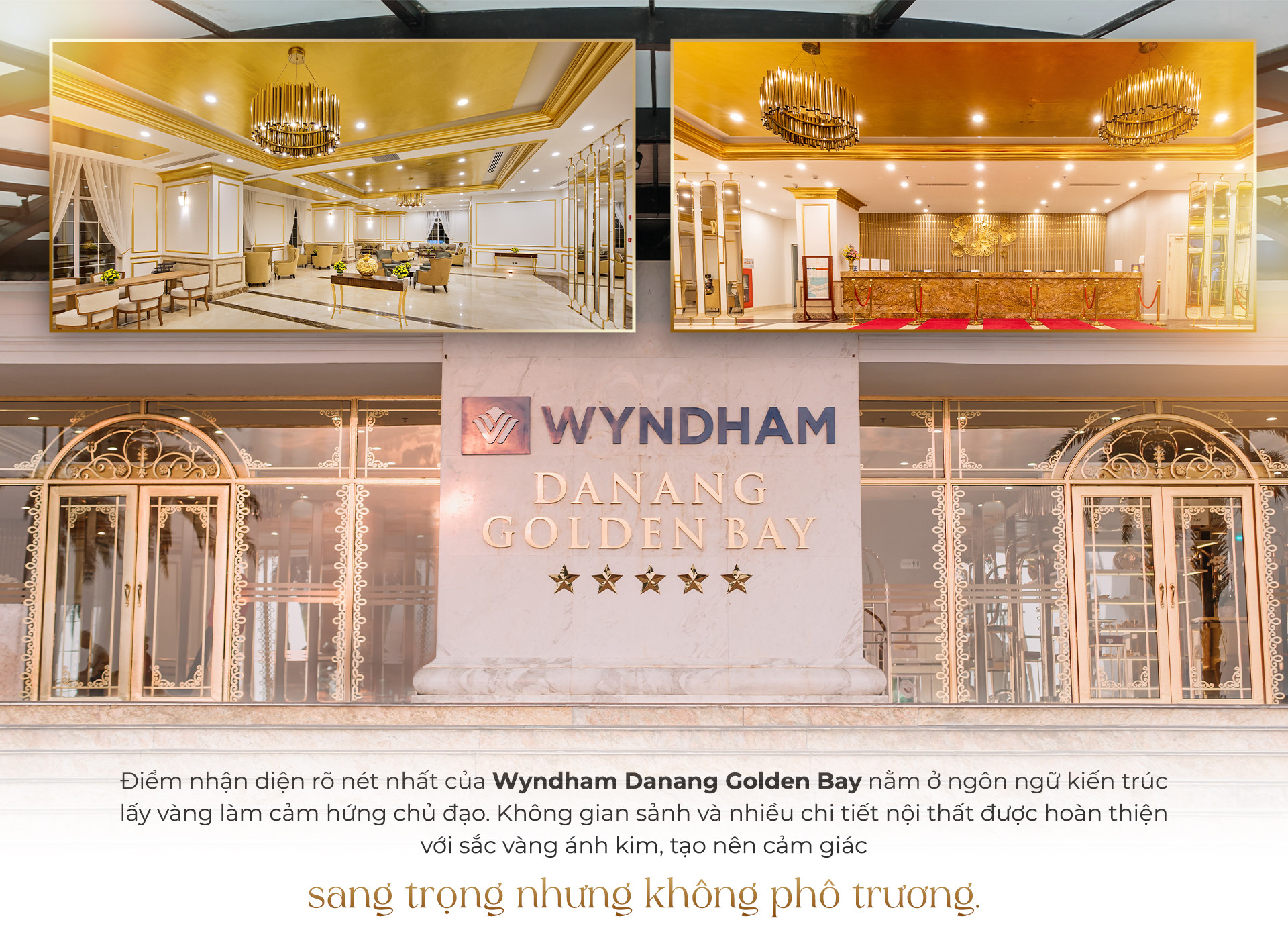 Điểm nhận diện rõ nét nhất của Wyndham Danang Golden Bay nằm ở ngôn ngữ kiến trúc lấy vàng làm cảm hứng chủ đạo. Không gian sảnh và nhiều chi tiết nội thất được hoàn thiện với sắc vàng ánh kim, tạo nên cảm giác sang trọng nhưng không phô trương. Thiết kế tổng thể theo phong cách hiện đại, chú trọng vào không gian mở và ánh sáng tự nhiên, giúp công trình hòa quyện với cảnh quan xung quanh thay vì tách rời khỏi thiên nhiên.