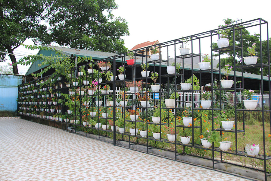 | Dàn chậu hoa ấn tượng được bố trí ở khu vực rửa tay của nhà vệ sinh Trường THPT Hoàng Quốc Việt (Đông Triều, Quảng Ninh). Ảnh: Nguyễn Thảo |