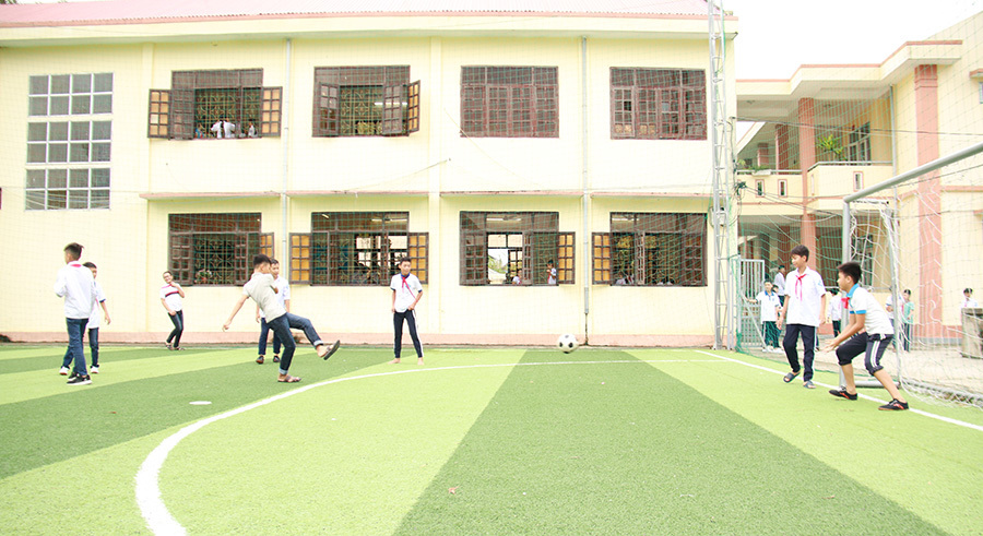 | Sân cỏ nhân tạo của Trường THCS Hồng Thái Tây (Đông Triều, Quảng Ninh) thu hút học sinh mỗi giờ giải lao. Ảnh: Nguyễn Thảo |