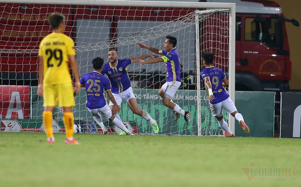 Đón bóng từ pha chuyển cánh của cầu thủ Hà Nội, Thái Quý đánh đầu chiến thuật để Xuân Tú thoát xuống loại bỏ hậu vệ và thủ môn Hải Phòng trước khi dứt điểm vào lưới trống.