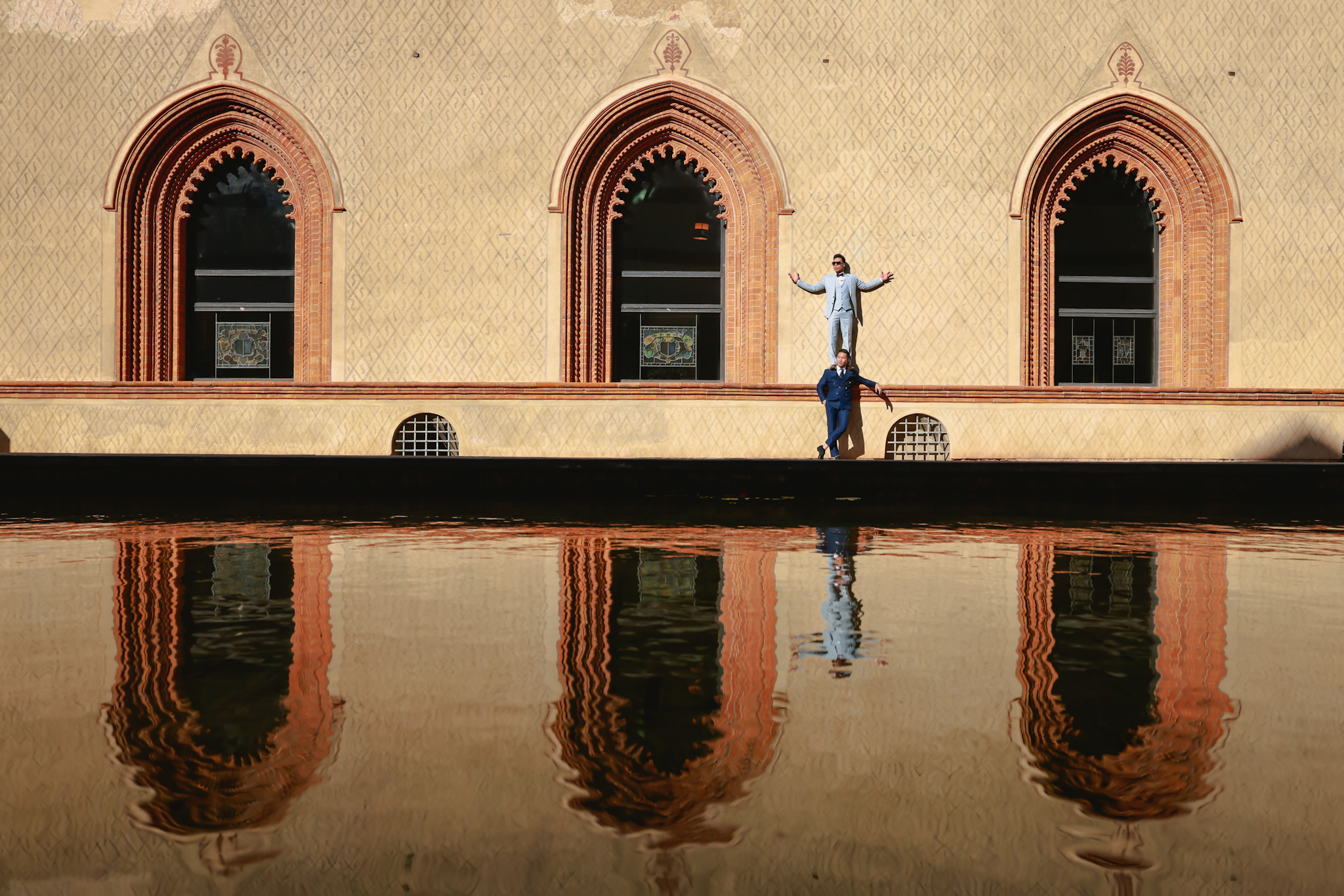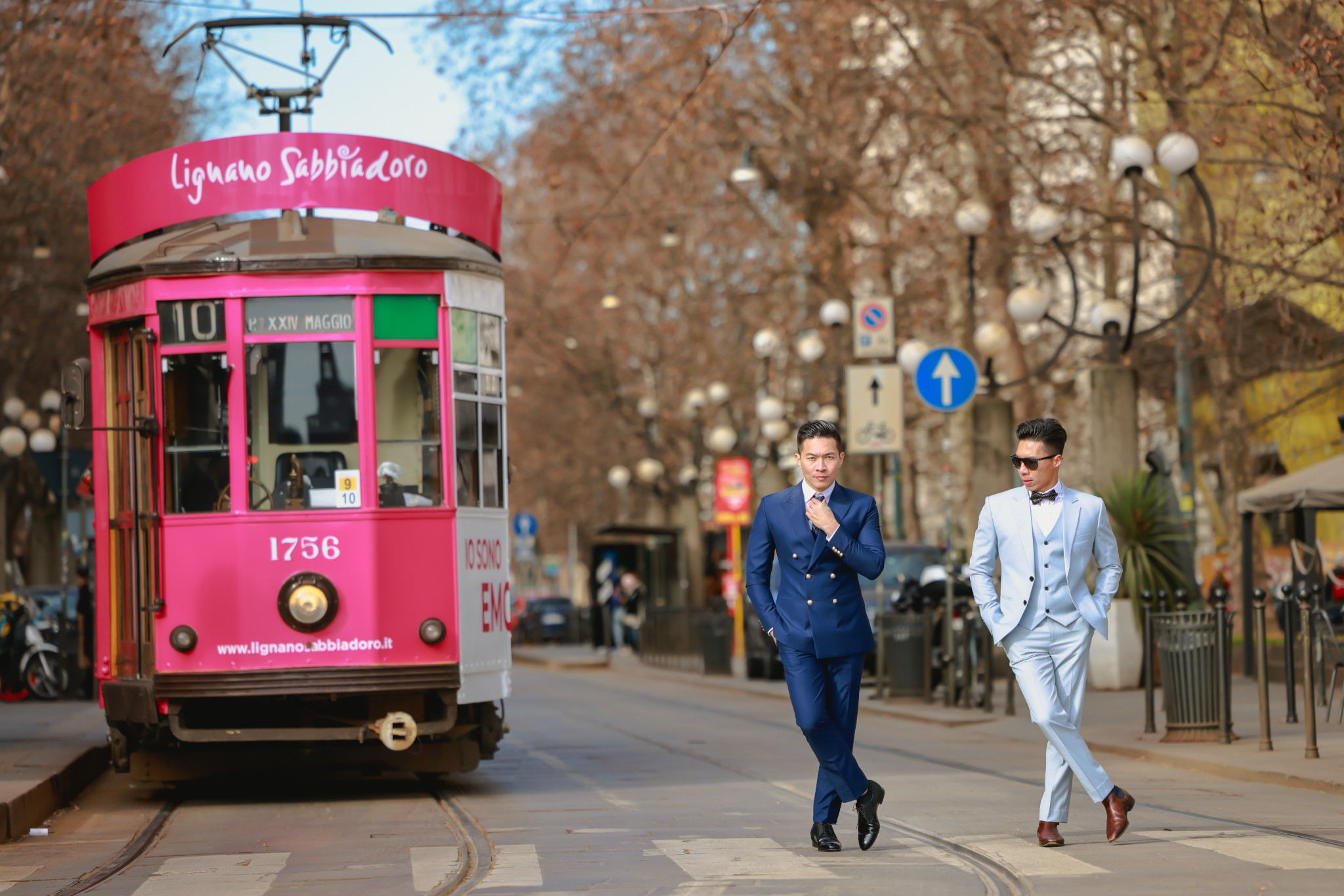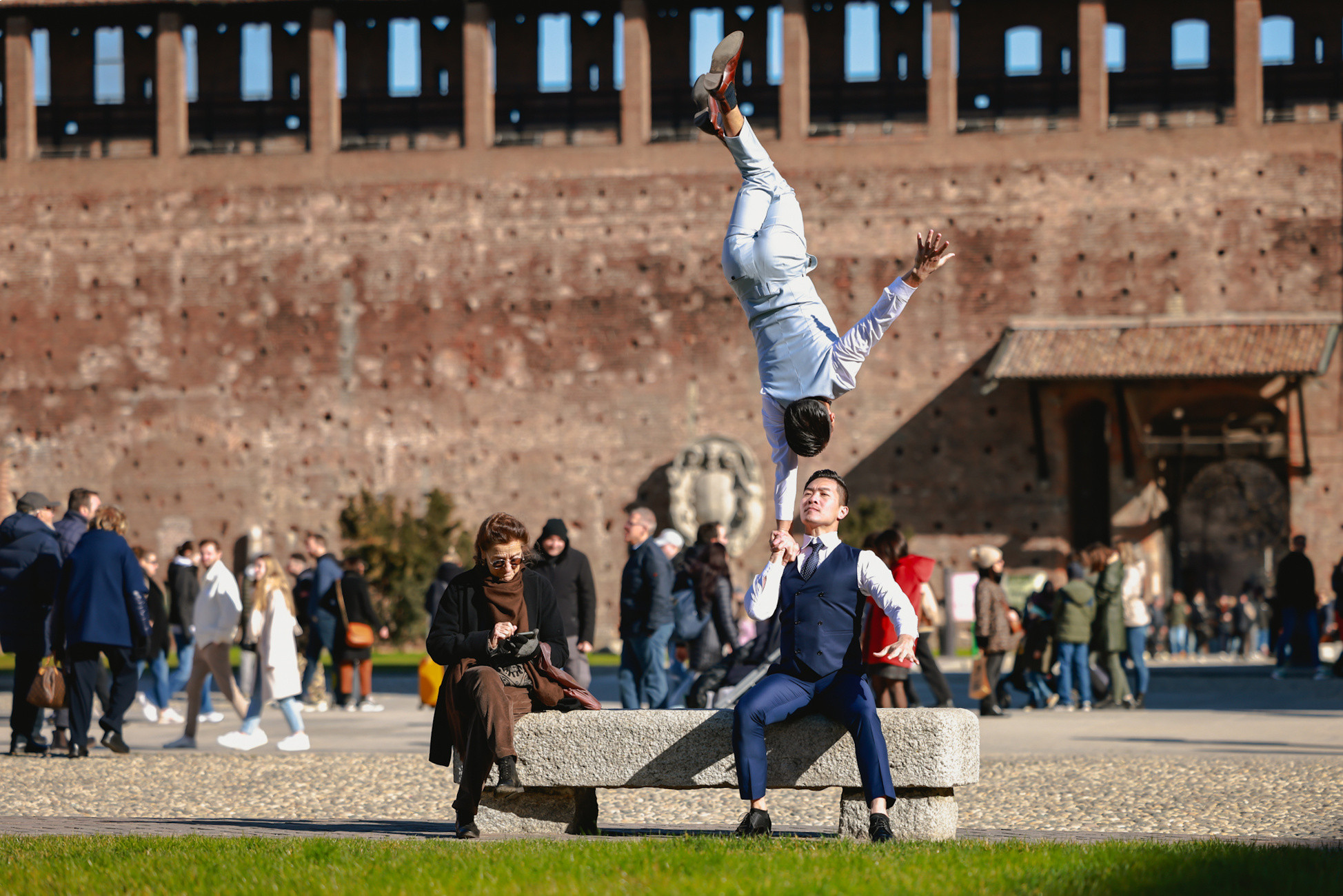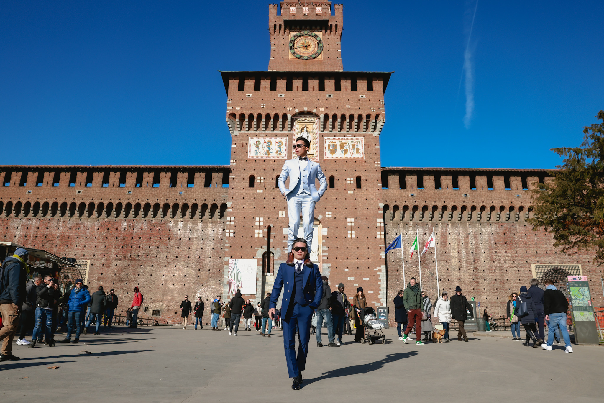 Nghệ sĩ xiếc Quốc Cơ và Quốc Nghiệp vừa dạo chơi, vừa thực hiện những động tác xiếc ở Milan trong bộ ảnh "Xiếc Việt trên đất Ý - Sàn diễn giữa đời thường".Họ xem thành phố cổ kính nổi tiếng thế giới này là sàn diễn khổng lồ. Trong ảnh, hai anh em chồng đầu sải bước tại đài tưởng niệm Vittorio Emanuele II 127 năm tuổi nằm ở trung tâm quảng trường Piazza Del Duomo.Anh em Quốc Cơ - Quốc Nghiệp tạo dáng trước ngân hàng Cesare Ponti Sede chi nhánh Milan. Địa điểm hai anh em không thể bỏ qua là nhà thờ chính tòa Milano - nhà thờ Công giáo La Mã lớn thứ 4 thế giới được xây dựng năm 1386, mất 500 năm mới hoàn thành.Hai nghệ sĩ xiếc diện trang phục vest đi dạo. Họ chọn thiết kế tông màu xanh lịch lãm, sang trọng thường gặp ở Milan, nơi được xem là kinh đô thời trang thế giớiSau đó, anh em nhà Giang di chuyển đến tòa nhà cổ Giureconsulti gần quảng trường Piazza Del Duomo.Bộ ảnh được thực hiện trong 6 tiếng với tiết trời 6 độ C nhiều gió và nắng. Họ thể hiện đúng tinh thần mang xiếc Việt chu du đất Italy.Quốc Cơ - Quốc Nghiệp tại con đường cổ Dante dẫn về lâu đài Sforzesco. Quá trình thực hiện bộ ảnh, hai anh em thu hút sự chú ý của nhiều người đi đường.