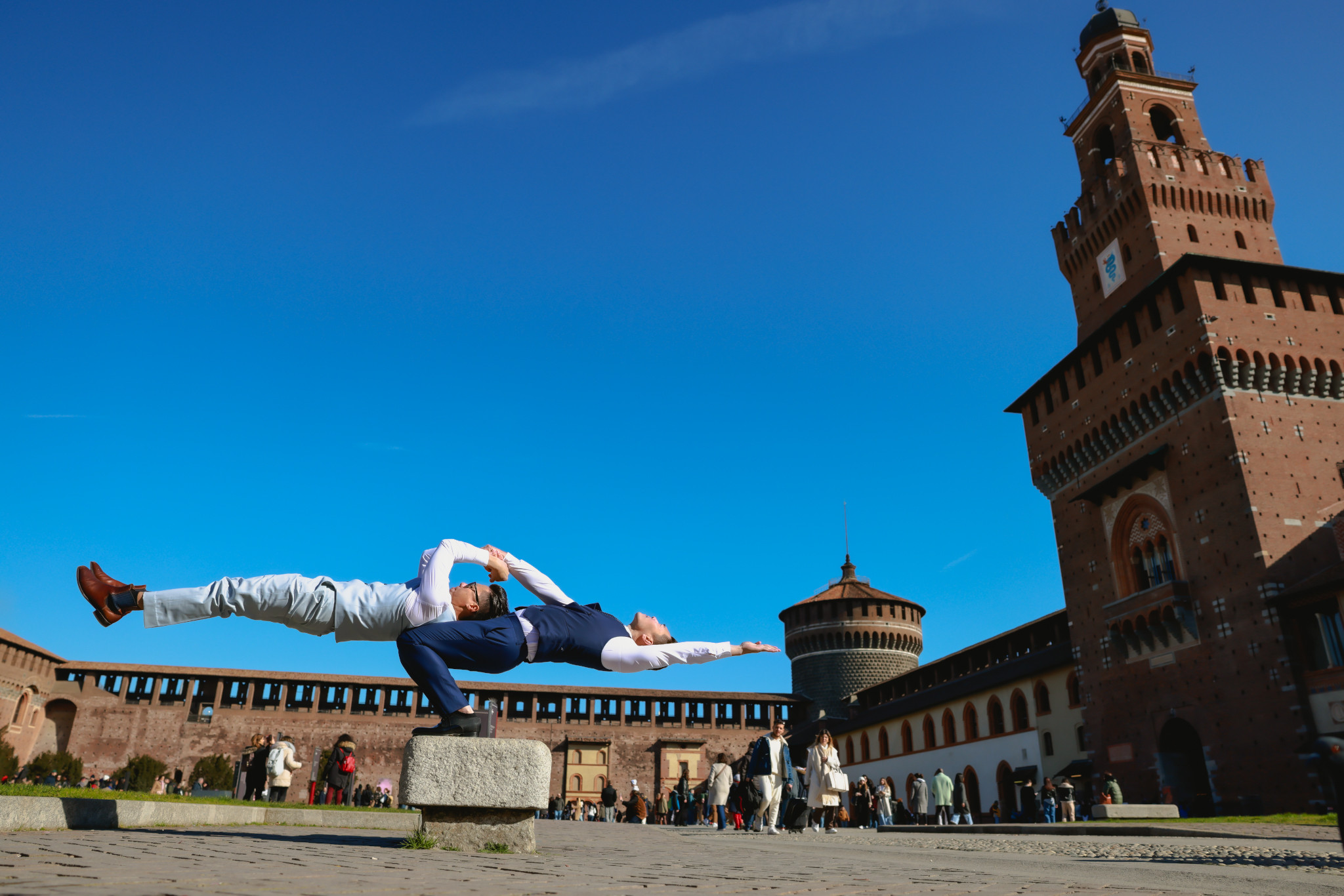 Hai NSƯT tham quan lâu đài Sforzesco 1.500 tuổi đẹp cổ kính, uy nghi. Họ thực hiện các động tác xiếc đã trình diễn suốt 20 năm qua.