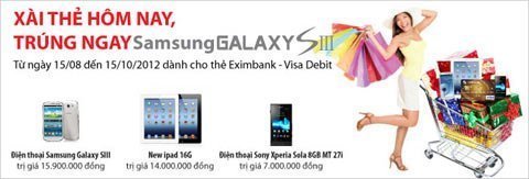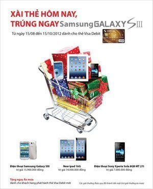 Chiếc điện thoại Galaxy SIII trị giá gần 16 triệu đồng sẽ được tặng ngay cho chủ thẻ có doanh số cao nhất vào cuối chương trình khuyến mãi “ Xài thẻ hôm nay, trung ngay Samsung Galaxy SIII”. Bên cạnh đó là các phần quà hấp dẫn khác.