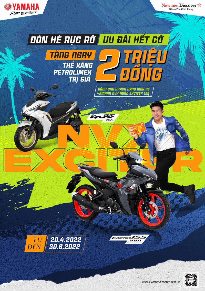 Chương trình dành riêng cho dòng xe Yamaha NVX và Exciter 155 VVA. Cụ thể, từ ngày 20/04/2022 - 30/06/2022, khách hàng mua 1 xe máy Yamaha NVX hoặc Yamaha Exciter 155 VVA sẽ được tặng ngay 1 thẻ đổ xăng Petrolimex trị giá 2 triệu đồng.