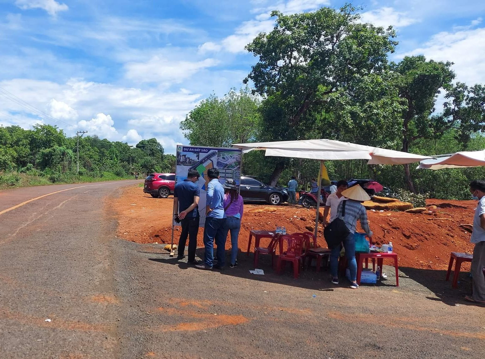 Hai bên đường, hàng trăm "cò đất” đưa bàn ghế ra ngồi bên lề đường chào mời mua đất tạo nên cảnh nhộn nhịp khác thường. Các khu đất trước đây là đất nông nghiệp, trồng cây cao su của người dân được giới “cò đất” phân lô trên giấy diện tích từ 10 - 15 mét ngang với chiều dài từ 50 - 100 mét (đối với đất nông nghiệp) và từ 5 mét trở lên (đối với đất thổ cư), giá bán dao động từ 220 - 350 triệu đồng/mét ngang tùy vào vị trí.