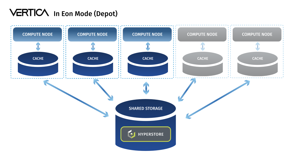 Vertica, ở chế độ Eon, tách biệt năng lực tính toán và lưu trữ. Bạn có thể thay đổi số lượng node tính toán hoặc node lưu trữ một cách linh hoạt và độc lập tùy theo nhu cầu. Điều này làm cho việc đáp ứng các yêu cầu ứng dụng cụ thể trở nên đơn giản hơn nhiều. Và nó tiết kiệm chi phí bằng cách cho phép bạn điều chỉnh kích thước phù hợp của tất cả các tài nguyên để tăng hiệu quả hoạt động.