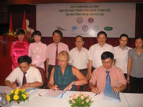 | Lễ ký thỏa thuận hợp tác giữa Phòng công nghệ phôi, Viện Công nghệ sinh học (Viện KH&CN Việt Nam), Trung tâm nano sinh học (Cộng hòa Pháp) và Trung tâm ươm tạo doanh nghiệp công nghệ cao (khu CNC Hòa Lạc). |