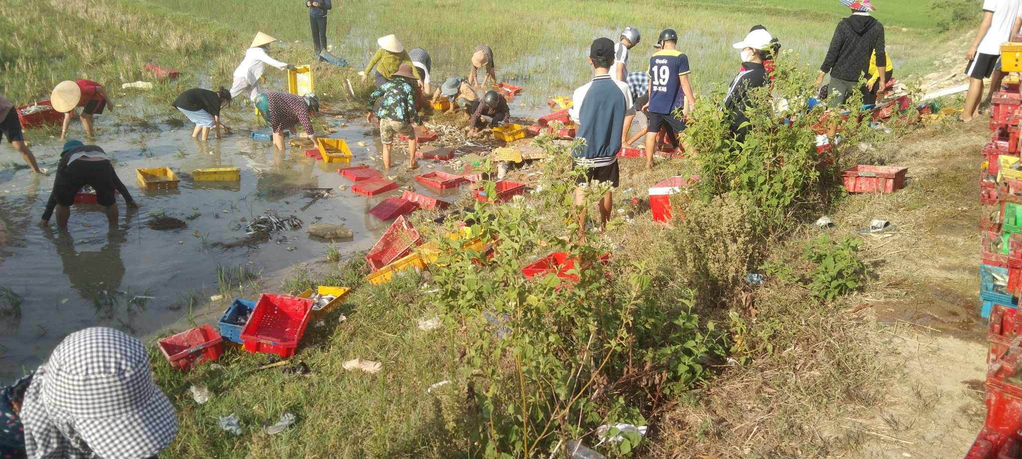 Tại hiện trường, hàng trăm sọt với khoảng 5 tấn cá rơi vãi khắp cả trên đường và dưới ruộng lúa của người dân.
