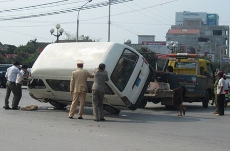 Khoảng 14h ngày 17/3, xe ô tô biển xanh loại 7 chỗ BKS 37A – 0294 chạy hướng từ Ga Vinh về đường Nguyễn Sỹ Sách (TP. Vinh), vừa tới ngã tư đã bị xe con BKS 38A – 006.72 chạy hướng sân bay Vinh theo đường Lê Nin đâm lật nghiêng.