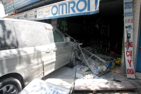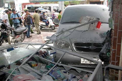 Khoảng 10g sáng ngày 8/10, chúng tôi có mặt tại cửa hàng dụng cụ y khoa Thành Công 1A Lý Thường Kiệt (P.7 Q. Tân Bình TP.HCM). Tai đây một quang cảnh hỗn độn. Đầu chiếc xe du lịch 72N-7452 nằm gọn trong tủ kính trưng bày hàng của cửa tiệm.
