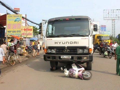 ![]() Một xe gắn máy đổ gục trước đầu xe bồn. ![]() |