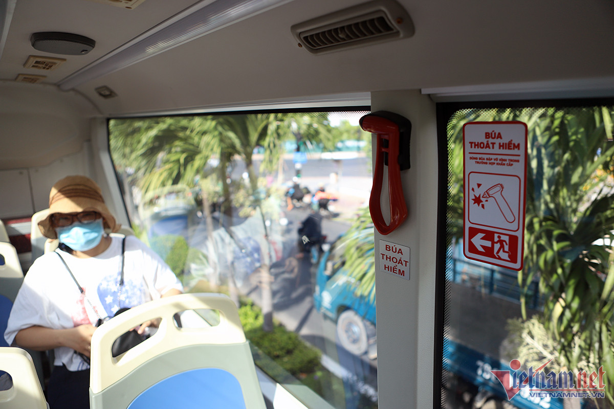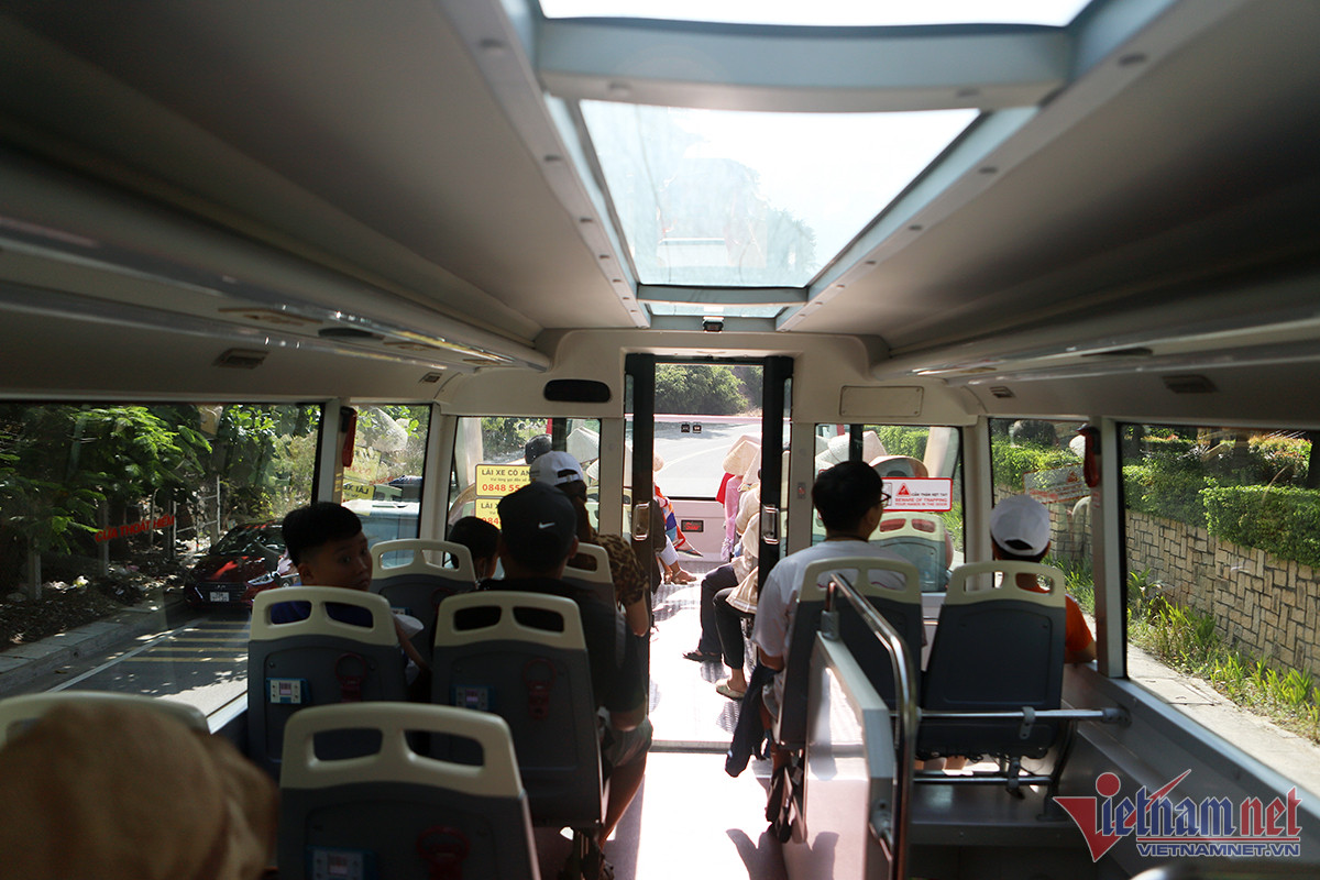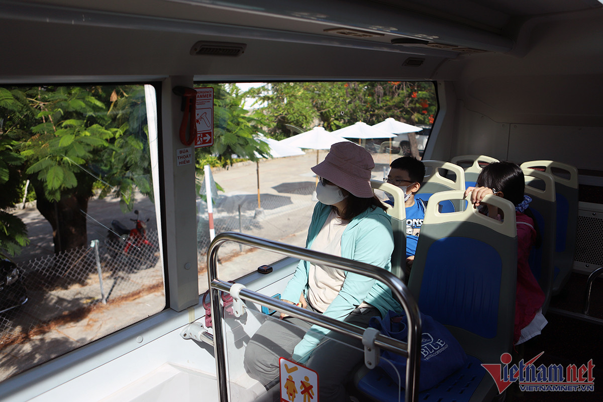 Tầng hai với 22 ghế máy lạnh, 20 ghế ngoài trời. Trên xe bố trí khu vực dành riêng cùng lối lên xuống cho người già, khuyết tật. “Lần đầu tôi trải nghiệm mô hình này ở phố biển, nên khá thú vị”, chị Quỳnh, người dân Nha Trang nói trong ngày đầu thử nghiệm xe buýt hai tầng.
