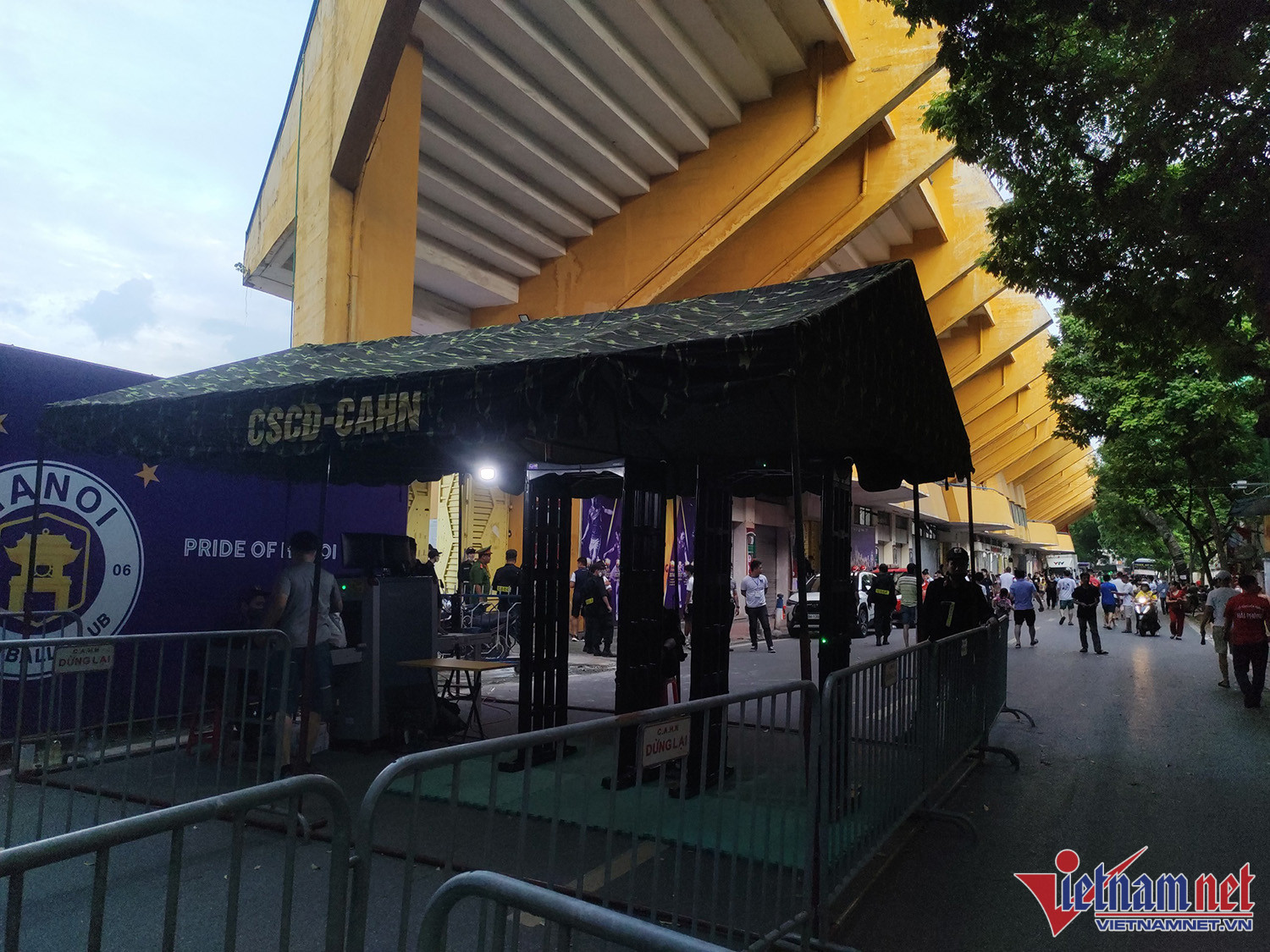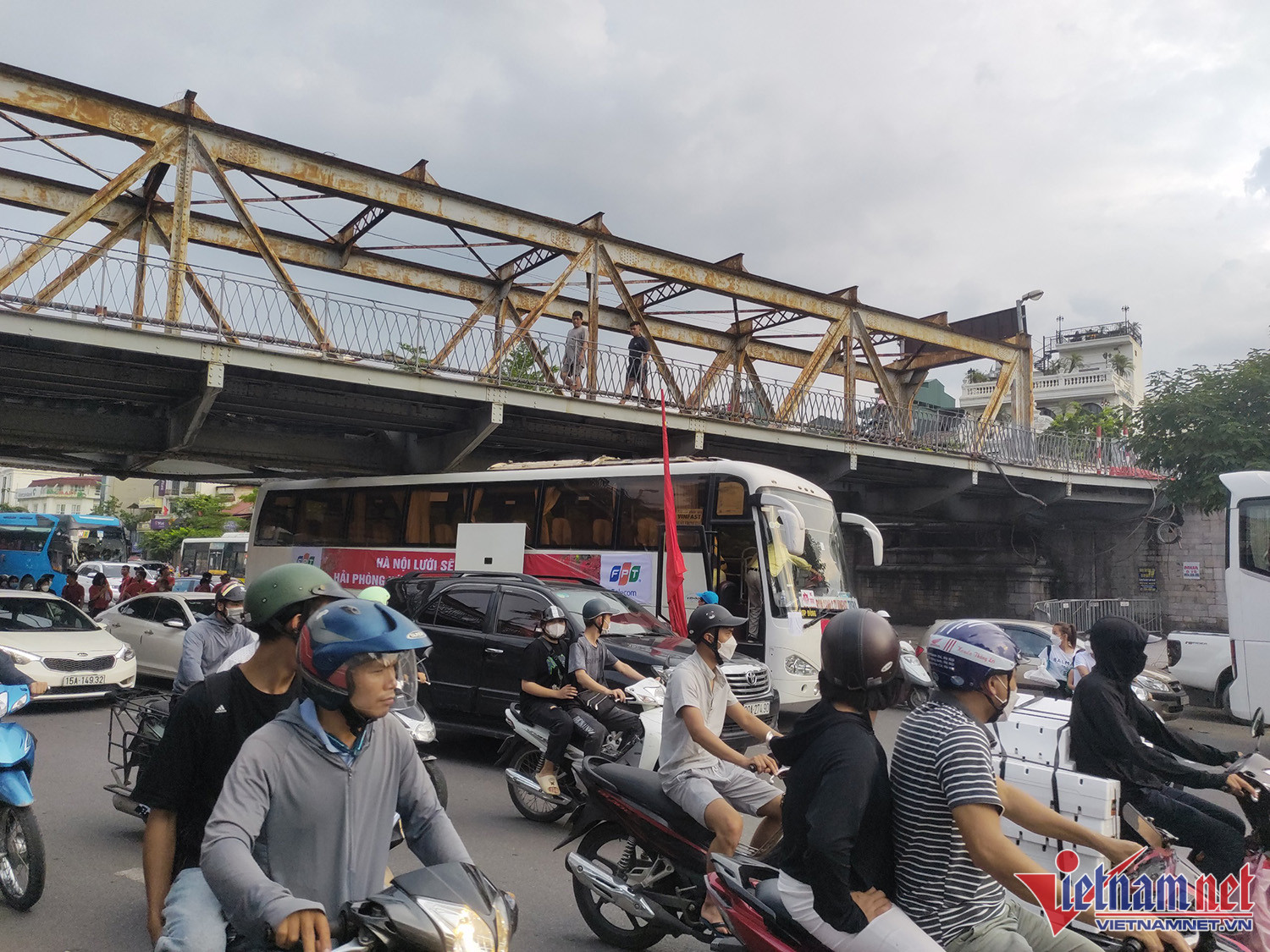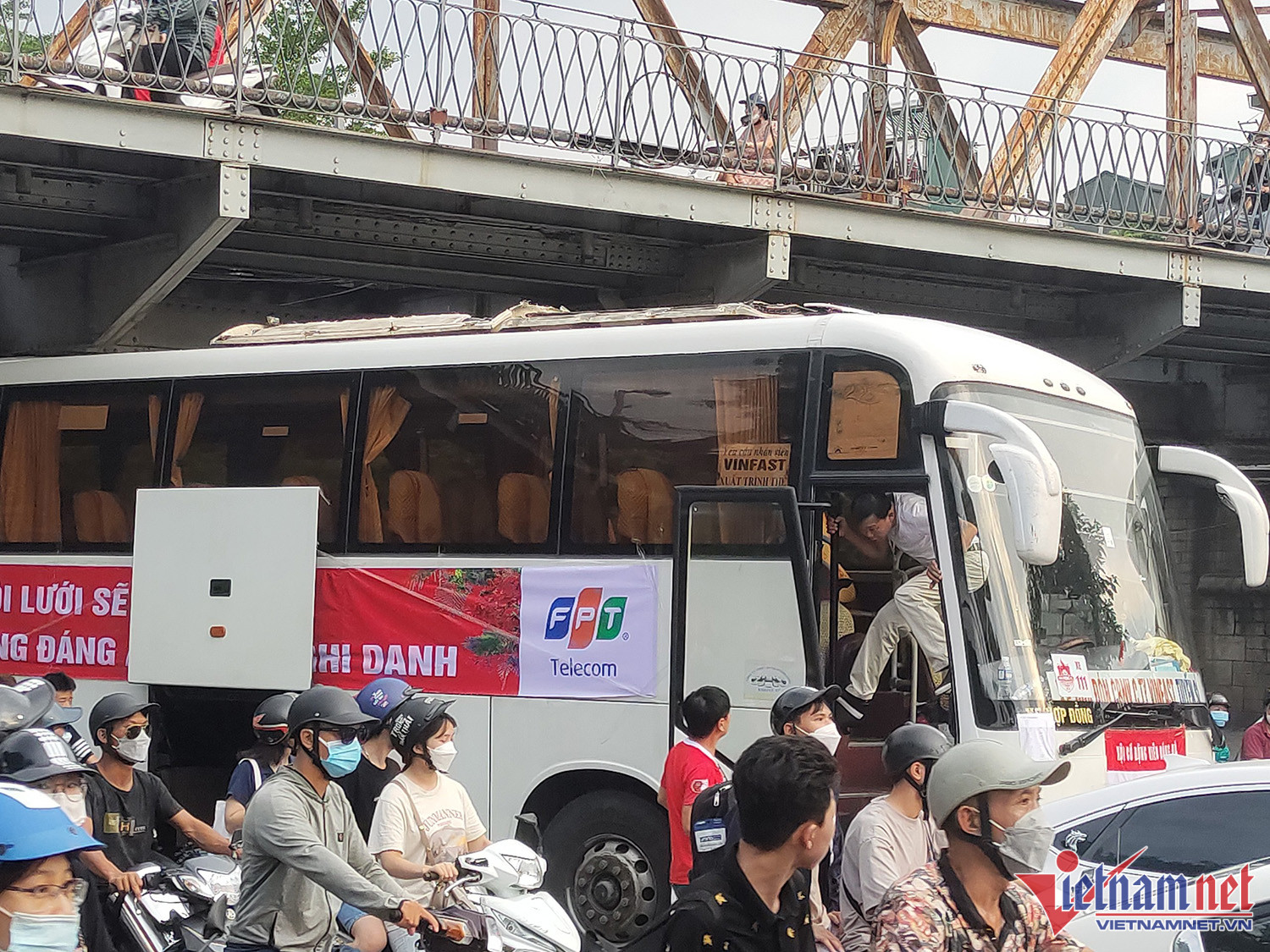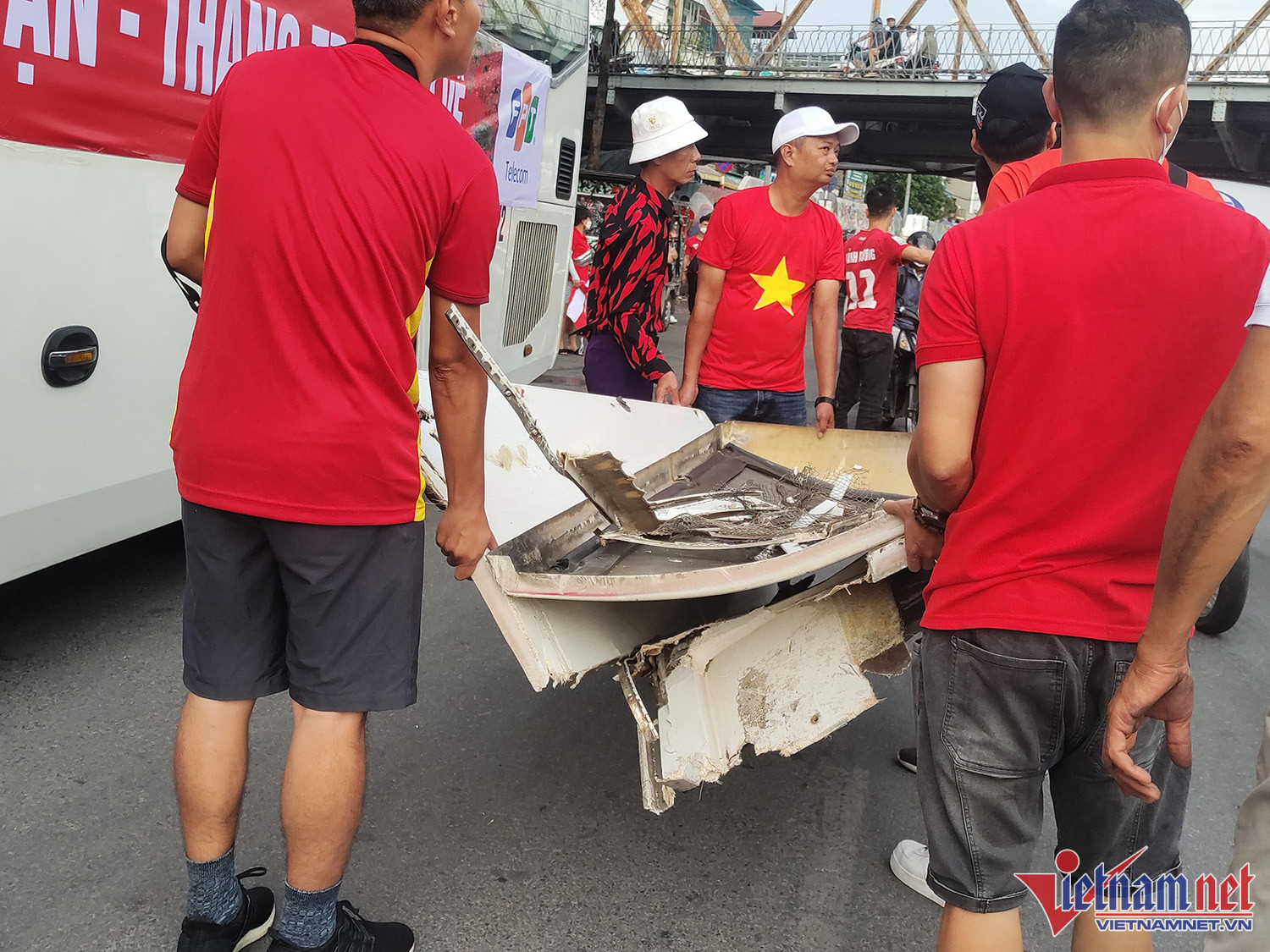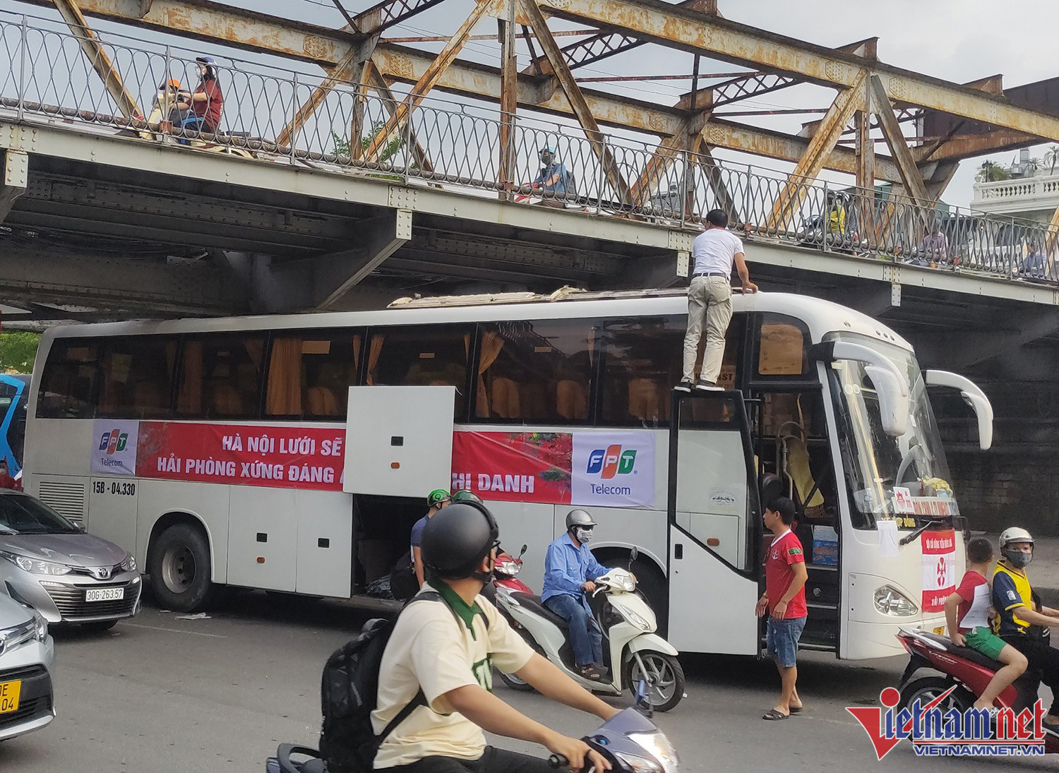 Vào khoảng 17h30, khi đang di chuyển tới sân Hàng Đẫy, xe chở CĐV Hải Phòng va chạm vào phầm gầm cầu Long Biên làm toàn bộ phần nóc xe bị hư hỏng nặng, có khói bốc lênNgay lập tức các CĐV trên xe chạy ra ngoài để phòng tránh hỏa hoạn. Lái xe cũng trèo lên phía nóc xe để kiểm tra tình hìnhSự cố khiến đoạn đường qua gầm cầu Long Biên bị tắc nghẽnCác CĐV chờ đợi trên vỉa hèPhần nóc xe bị bung ra. Trong khi đó, các xe chở CĐV Hải Phòng khác tiếp tục di chuyển tới sân Hàng Đẫy. Trên đường đi, CĐV đất Cảng đốt pháo sáng gây sự chú ý của người đi đườngMỗi lần làm khách trên sân của Hà Nội FC, hàng nghìn CĐV Hải Phòng theo chân tiếp sức đội nhàLực lượng an ninh làm nhiệm vụ trước trận đấu, kiểm tra và ngăn chặn không cho các CĐV Hải Phòng mang pháo sáng vào sân. Trận đấu giữa Hà Nội vs Hải Phòng diễn ra vào lúc 19h15.