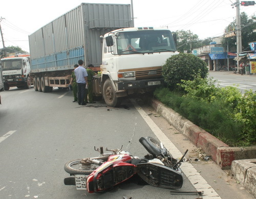 Tại hiện trường, đầu xe container BKS 70K - 1873 nằm gác lên dải phân cách. Phía trước một thanh niên nằm thoi thóp trên vũng máu bên cạnh xe máy BKS 76X7 - 7013 vỡ nát. Trên mặt đường, phía sau xe container hằn lên nhiều vết bánh.