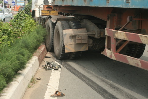 | Chiếc đèn xe máy và đôi dép của nạn nhân bên cạnh xe container |