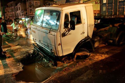 Do tránh một chiếc taxi, xe đầu kéo đi vào khu vực ngập nước và bị lún không thể vượt lên. Sau đó xe lún dần ghim đầu xuống hố sâu.