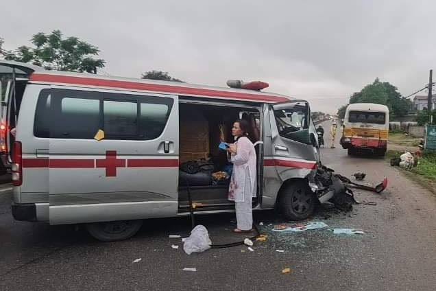 Cú tông mạnh khiến đầu xe cứu thương biến dạng, người ngồi bên ghế phụ xe cứu thương bị thương. Xe buýt hỏng hóc phần đuôi.