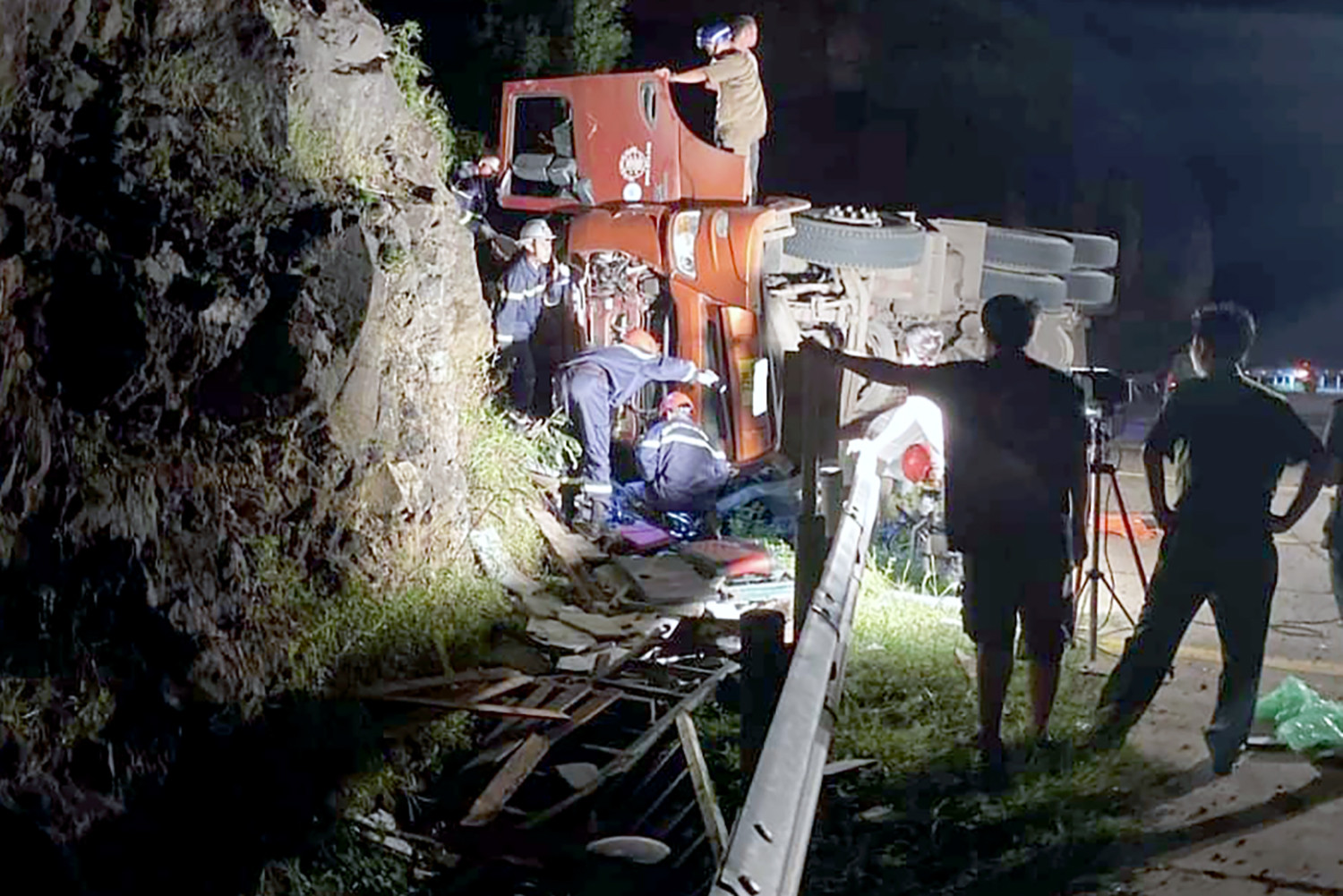Khuya 18/9, tài xế Võ Văn Lưu (33 tuổi, quê Bình Định) lái xe đầu kéo đi trên đường xã An Mỹ, huyện Tuy An, thì loạng choạng tông rồi đâm vào vách núi bên phải đường, lật nghiêng.