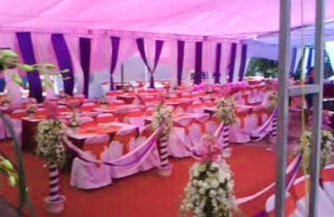 | Đám cưới được tổ chức ngay tại sân trụ sở của phường Phú Thịnh, thị xã Sơn Tây, Hà Nội với sân khấu được trải thảm đỏ từ ngoài cổng vào trong với sự trang hoàng hoành tráng. |