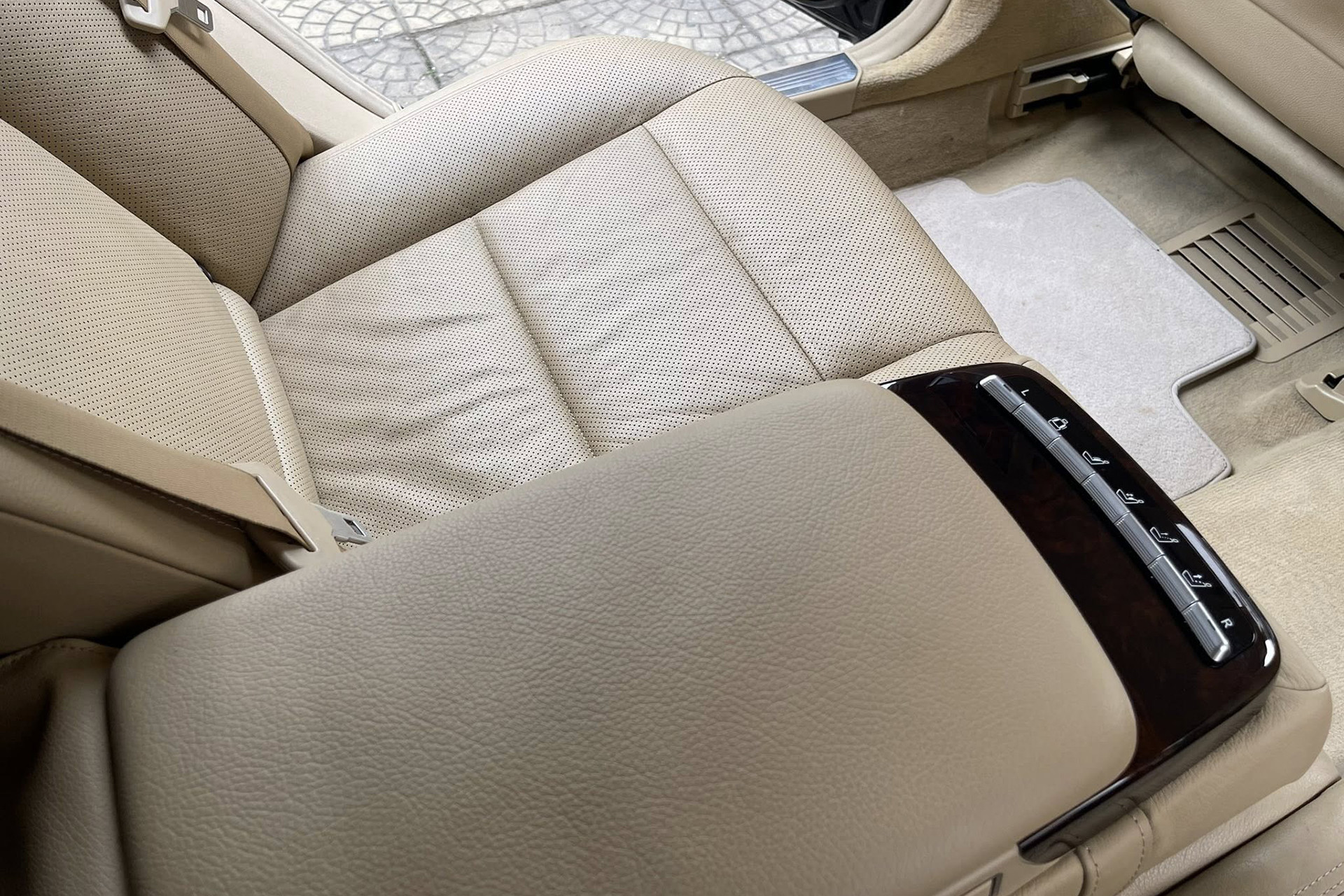 Ghế ngồi bọc da đã xuất hiện vết nhăn, trong đó nhiều nhất là vị trí ghế người lái. Theo một người kinh doanh xe sang, người dùng khi tìm mua xe sang cũ trên 10 năm tuổi nên bọc lại da cho khoang nội thất, giúp tổng thể xe mới mẻ hơn, đồng thời dễ dàng chăm sóc, vệ sinh trong quá trình sử dụng.