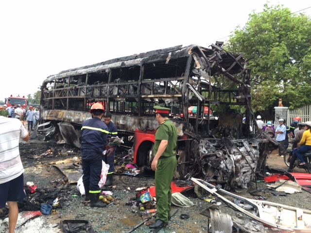 Tại hiện trường, 2 xe khách BKS 51B 11224 và 38N 5577 bị cháy rụi; xe tải BKS 86C 05388 bị cháy rụi phần đầu xe.
