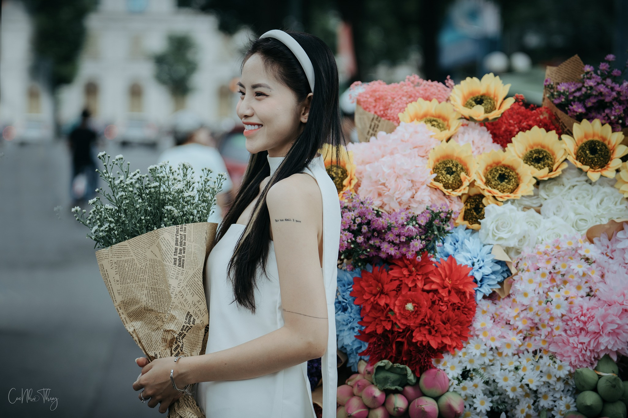 "Đứng cạnh những xe hoa này mình cảm thấy như đang trải nghiệm chút mùa thu lãng mạn của Hà Nội", cô nói thêm.