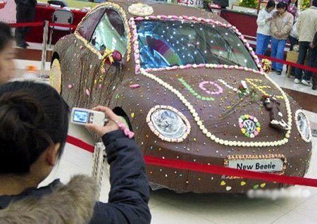 | Volkswagen Beetle được dán một lớp nhựa rồi phủ ở ngoài cùng là sôcôla. Ảnh: CNSphoto. |