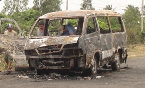| Sau vụ cháy, chiếc xe khách bị thiêu rụi gần như hoàn toàn (Ảnh: TTXVN) |