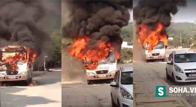 Chiếc ô tô khách loại 29 chỗ đậu bên lề đường bỗng dưng bốc cháy dữ dội ở phần đầu xe, chỉ trong ít phút, ngọn lửa đã bao trùm cả chiếc xe.