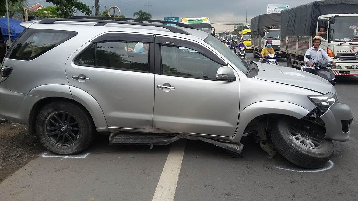 Chiếc xe ô tô bị gãy trục bánh xe trước bên phải hư hỏng nặng. Công an huyện Châu Thành đã tới xử lý hiện trường, điều tiết giao thông.