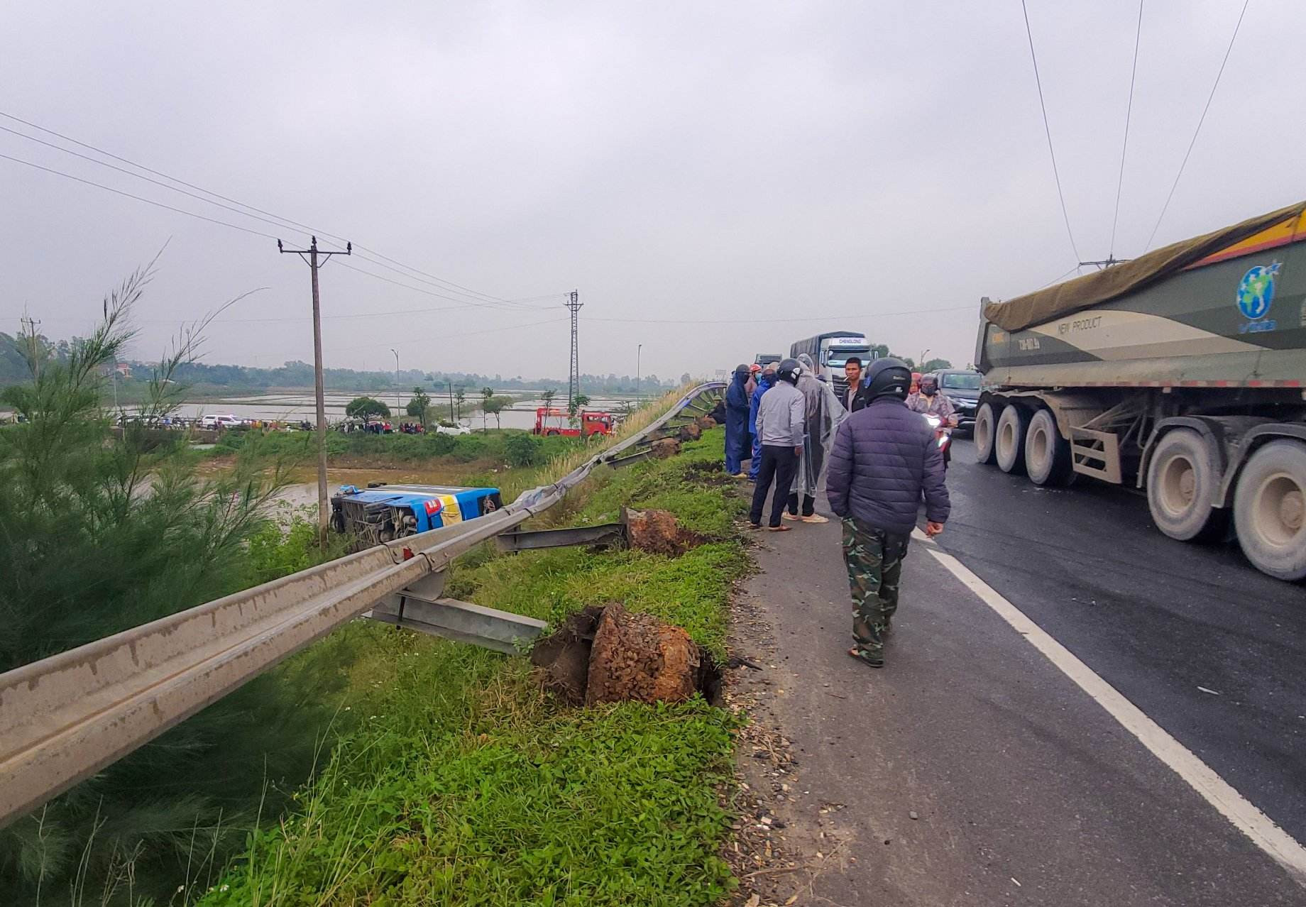 Sau cú va chạm với ô tô con, xe khách giường nằm tiếp tục tông vào một xe máy đang đứng bên vệ đường rồi lao khỏi taluy chắn và đâm xuống ruộng.