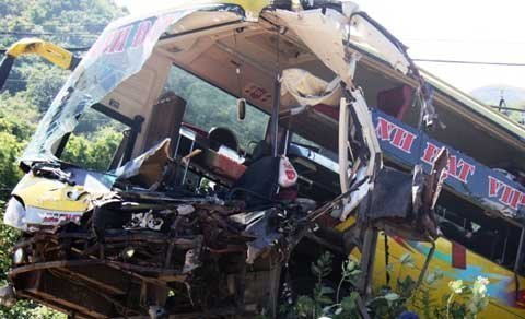 Sau cú đâm, chiếc xe khách quay mấy vòng, nửa thân sau tuột xuống vệ đường, đầu xe biến dạng