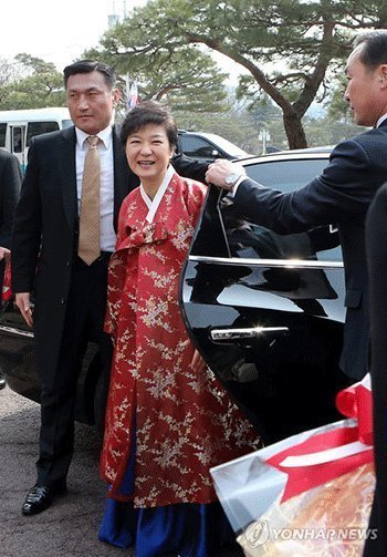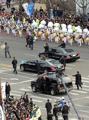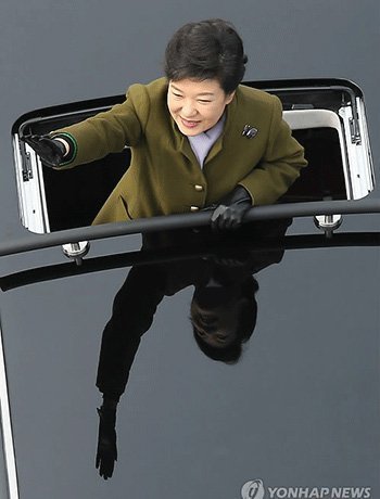 | Tân Tổng thống Hàn Quốc - Park Geun Hye - trên chiếc limo đặc biệt trong lễ nhậm chức hôm 25/2. |
