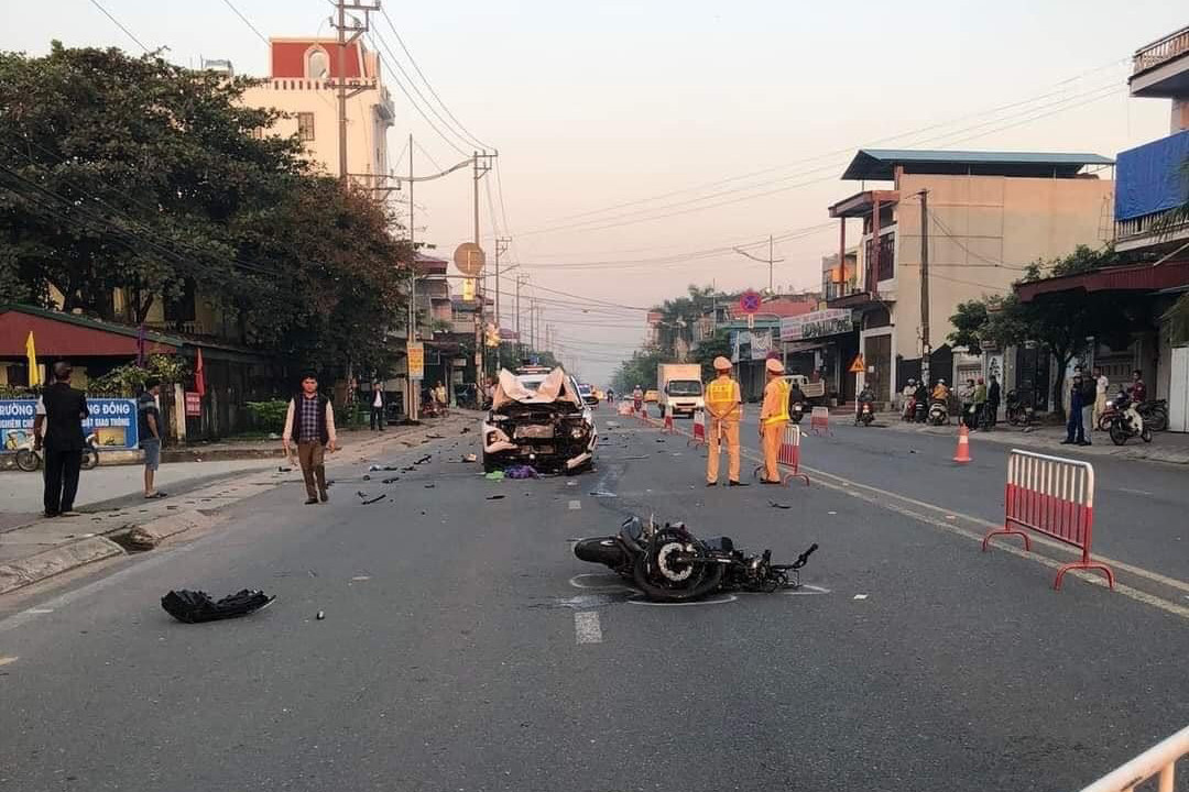 Cú va chạm khiến 3 người đi xe máy ngã xuống đường, 2 người chết tại chỗ, người còn lại bị thương nặng được đưa cấp cứu. Vụ tai nạn cũng làm đầu xe ô tô và xe máy hư hỏng nặng, các mảnh vỡ văng tung tóe khắp mặt đường.