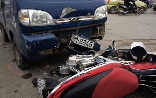Lái xe ô tô tải tên Thịnh phân trần: Khi ô tô đang qua gần hết ngã tư, tín hiệu đèn giao thông đang ở màu xanh còn khoảng 20 giây, thì chiếc xe máy phóng lên. Qúa bất ngờ, tôi đã đạp phanh, nhưng không tránh được chiếc xe máy.