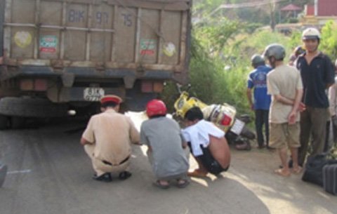 Thời điểm trên, chiếc xe tải 12 tấn BKS 81K-9775 (chưa rõ người điều khiển) sau khi đổ dốc đã đâm vào xe máy chở 4 BKS 93L1-022.58 chạy cùng chiều phía trước.