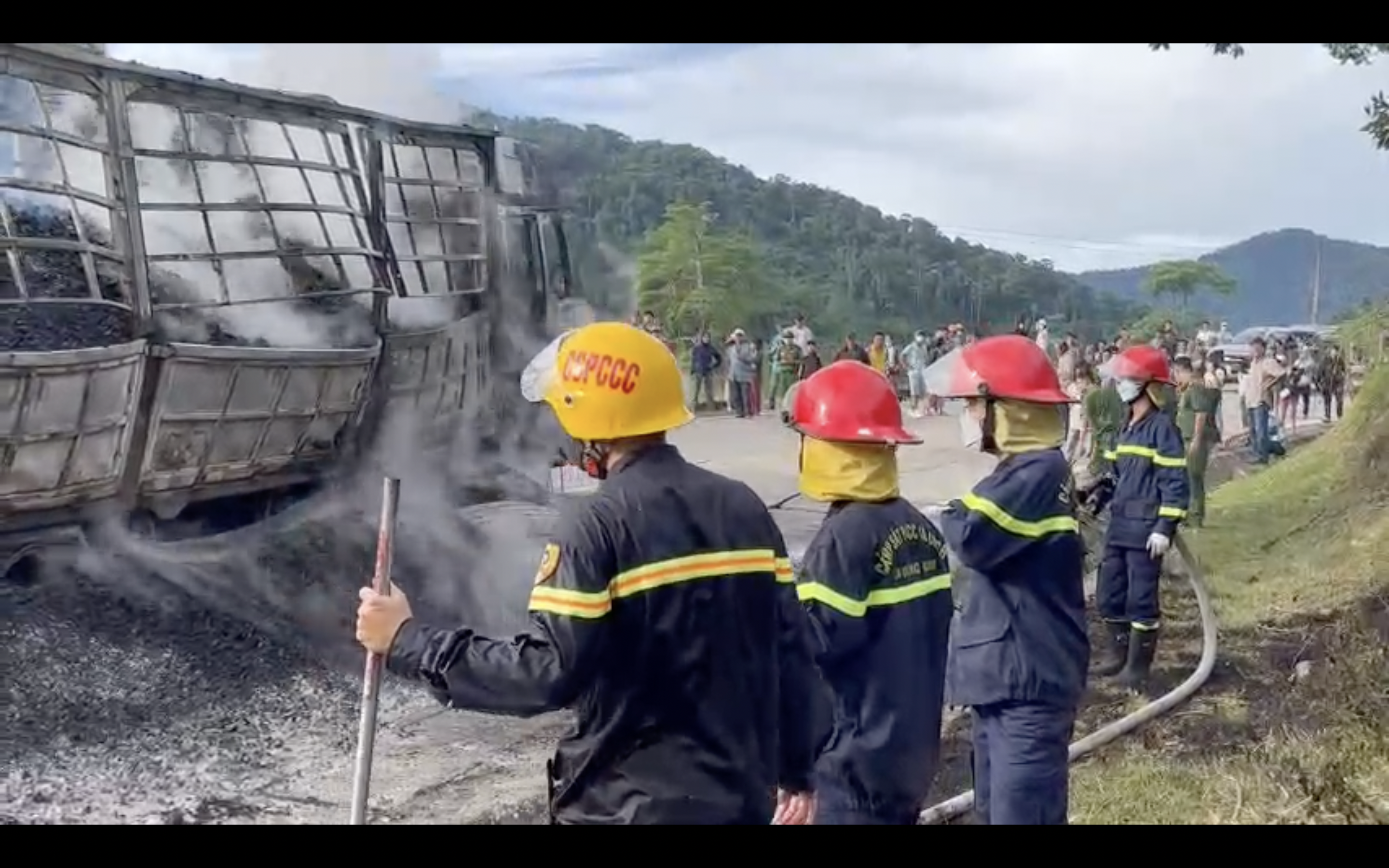 Đến thời điểm hiện tại, ngọn lửa cơ bản được khống chế. Lực lượng Cảnh sát PCCC đang xử lý lượng than cháy âm ỉ trên xe tải.