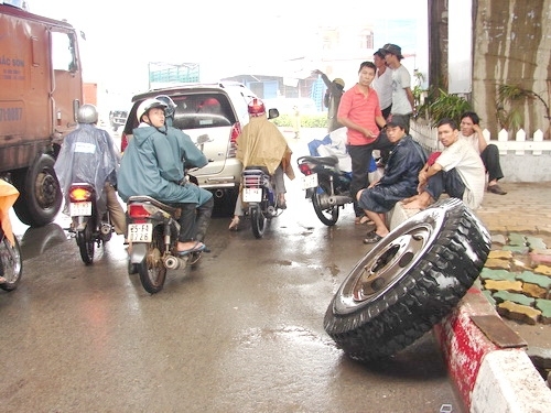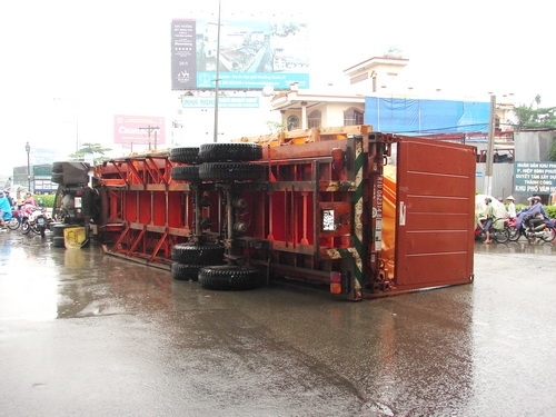 bánh của rơ-móc văng ra ngoài làm mất thăng bằng lật ngang giữa đường.