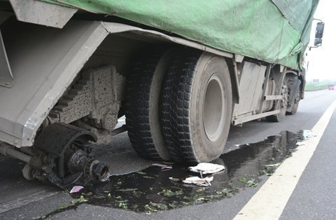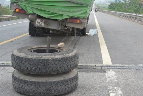 Tại hiện trường, 2 bánh sau bên phải của chiếc xe tải 12 bánh đã bị văng ra lòng đường, dầu máy chảy ra loang lổ. Vì sự cố bất ngờ xảy ra khi chiếc xe đang chạy với tốc độ nhanh, khoảng 60km/h nên tài xế phanh gấp, kéo lê chiếc xe khoảng 3m trên quốc lộ.