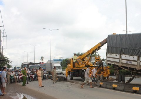 Lực lượng CSGT quận 12 đã khẩn trương điều động xe cẩu đến hiện trường nhằm sắp xếp lại các khối bê tông, giải tỏa ách tắc đồng thời chuyển xe tải đi nơi khác trả thông thoáng cho quốc lộ 1A.
