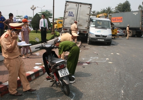 Người phụ nữ đi trên xe máy này được xác nhận là Đỗ Thị Kim Thu (54 tuổi) chết tại chỗ. Người cầm lái, chồng chị Thu là anh Nguyễn Văn Danh bị thương trong tình trạng hết sức nguy kịch.