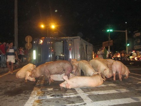 Lực lượng an ninh địa phương và CSGT đã có mặt tại hiện trường để giữ trật tự và lập biên bản vụ việc. Phải 2 giờ sau mới có một xe cẩu đến để cẩu xe bị nạn và một xe tải chuyển toàn bộ số heo sống và chết đi nơi khác.